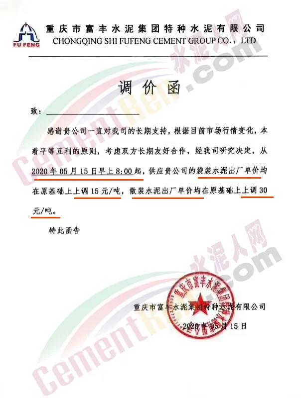 重慶市富豐水泥集團(tuán)特種水泥有限公司通知,根據(jù)目前市場行情變化 ,經(jīng)公司研究決定從5月15日早8時(shí)起,袋裝水泥出廠價(jià)上調(diào)15元/噸,散裝水泥出廠價(jià)上調(diào)30元/噸。