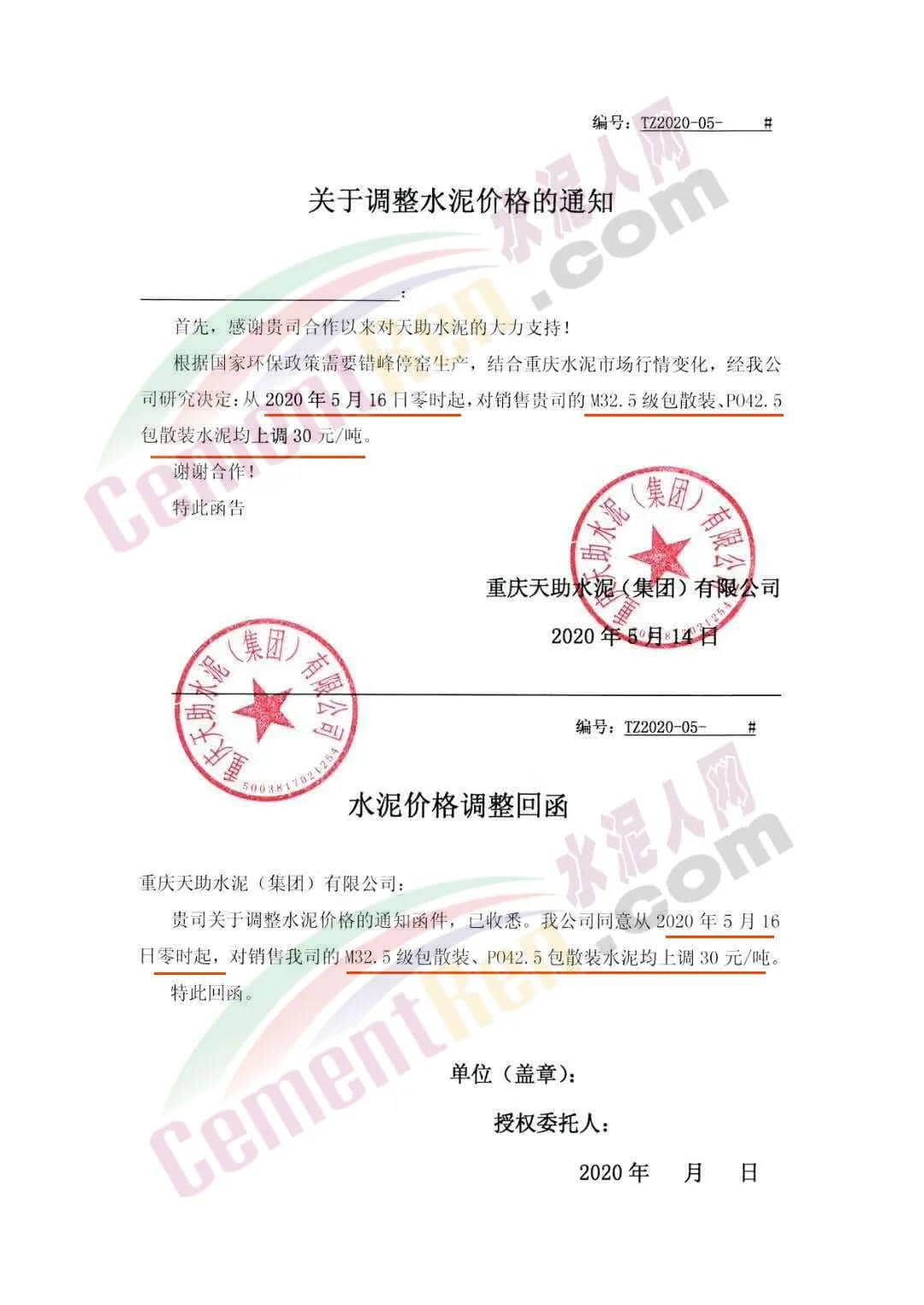 重慶天助水泥(集團(tuán))有限公司通知根據(jù)國家環(huán)保政策需要錯(cuò)峰停窯,結(jié)合 重慶水泥市場行情變化,經(jīng)公司研究決定從5月16日零時(shí)起,對(duì)M32.5級(jí)PO42.5級(jí)包裝和散裝水泥價(jià)格上調(diào)30元/噸。
