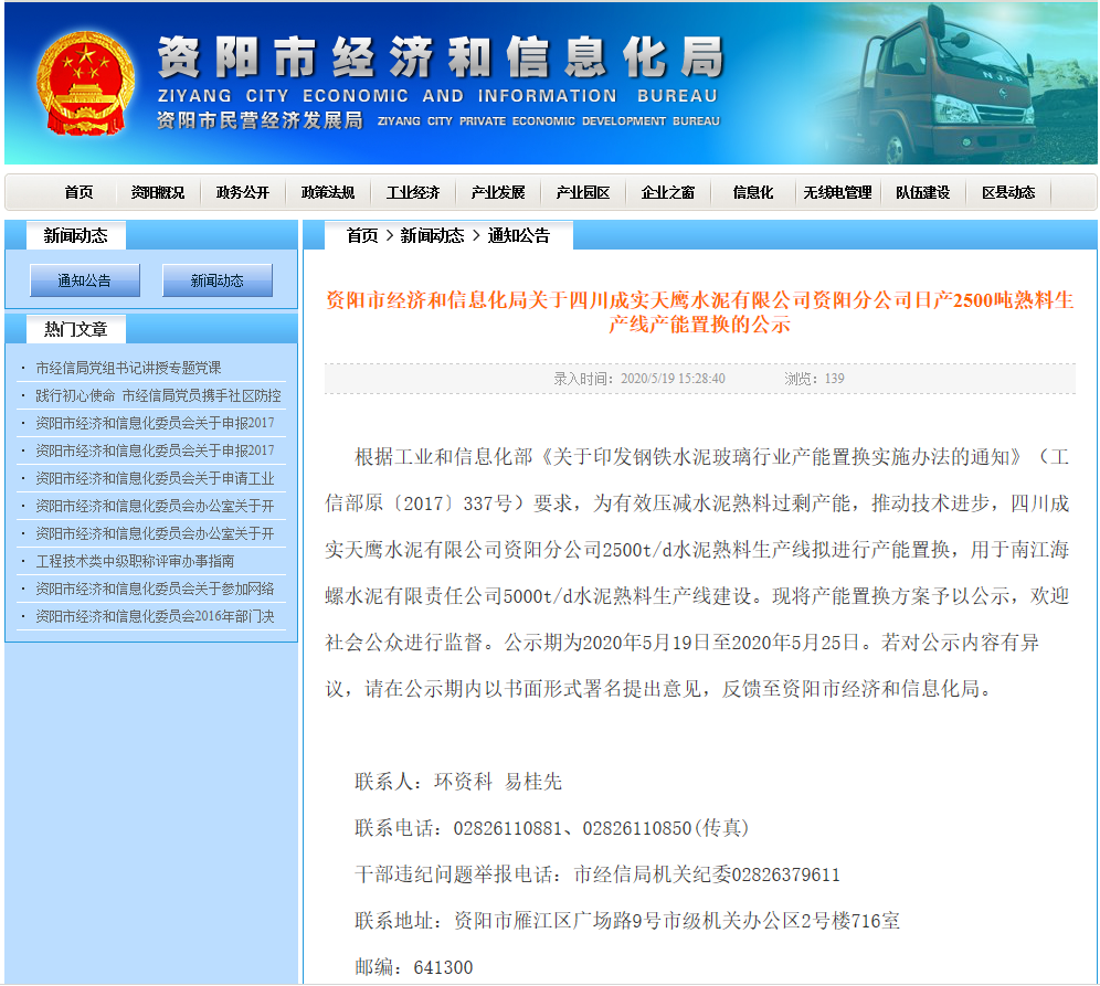 據(jù)水泥人網(wǎng)了解,日前,四川省資陽(yáng)市經(jīng)濟(jì)和信息化局發(fā)布《關(guān)于四川成實(shí)天鷹水泥有限公司資陽(yáng)分公司日產(chǎn)2500噸熟料生產(chǎn)線產(chǎn)能置換的公示》稱(chēng)海螺水泥擬在四川省巴中市南江縣建設(shè)一條5000t/d水泥熟料生產(chǎn)線。公示全文如下: