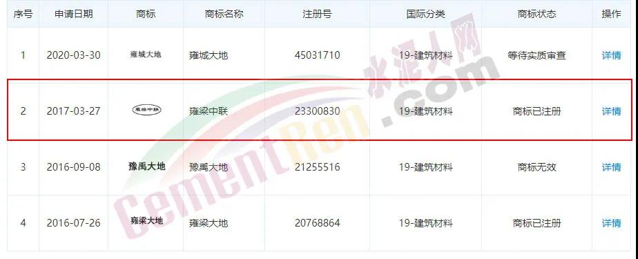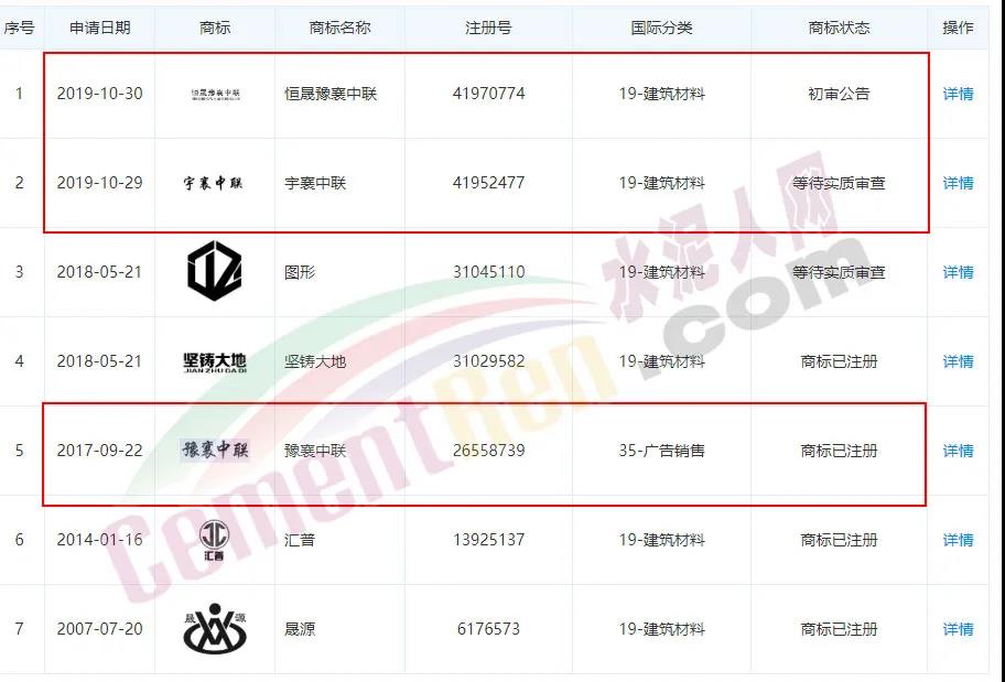 許昌市恒晟水泥有限公司 :“豫襄中聯(lián)”商標(biāo)已注冊; “宇襄中聯(lián)” 等待實(shí)質(zhì)審查;“恒晟豫襄中聯(lián)” 初審公告
