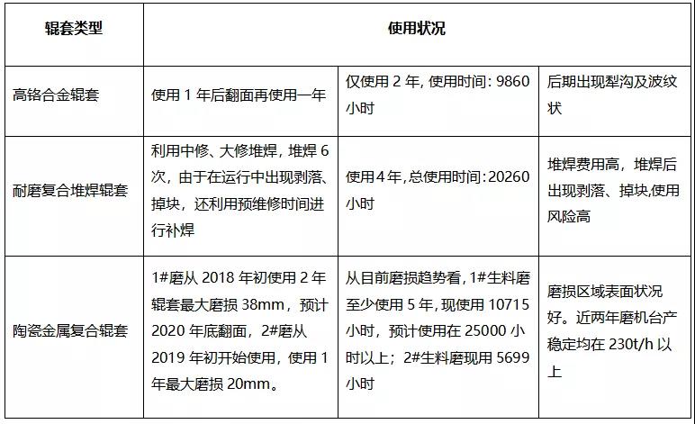 我們工廠在生料磨輥套和磨盤襯板使用上,曾用過高鉻鑄鐵輥套和磨盤襯板、耐磨堆焊復合輥套和磨盤襯板,在2018年4月對1#生料磨將原耐磨堆焊復合輥套和磨盤襯板更換為重慶羅曼新材料科技有限公司制造的“蜂窩王”陶瓷金屬復合輥套和磨盤襯板,又在2019年3月對2#生料磨同樣更換為該公司制造的陶瓷金屬復合輥套和磨盤襯板。我們對近幾年輥套的使用做了以下對比: