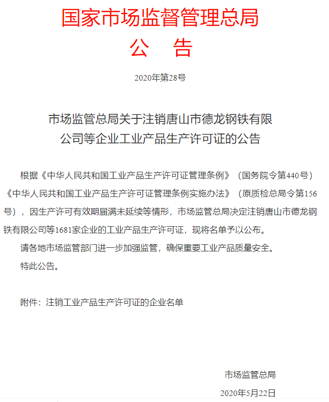 日前,國(guó)家市場(chǎng)監(jiān)督管理總局發(fā)布《關(guān)于注銷唐山市德龍鋼鐵有限公司等企業(yè)工業(yè)產(chǎn)品生產(chǎn)許可證的公告》(2020年第28號(hào))稱:因生產(chǎn)許可有效期屆滿未延續(xù)等情形,市場(chǎng)監(jiān)管總局決定注銷唐山市德龍鋼鐵有限公司等1681家企業(yè)的工業(yè)產(chǎn)品生產(chǎn)許可證,其中注銷水泥產(chǎn)品生產(chǎn)許可證共106個(gè)編號(hào)。