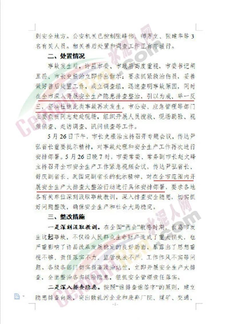 5月26日下午,市長史根治主持如開專題會議,傳達(dá)尹弘省長重要批示精神,對事故處理和安全生產(chǎn)工作再次進(jìn)行安排部署。當(dāng)時晚7時,市委常委,常務(wù)副市長趙文峰主持召開全市安全生產(chǎn)工作緊急視頻會議,傳達(dá)省領(lǐng)導(dǎo)批示精神,對全市范圍內(nèi)開展安全生產(chǎn)大排查大整治行動進(jìn)行具體安排部署,要求各地各有關(guān)單位深刻汲取事故教訓(xùn),深入排查安全隱患,切實(shí)抓好問題整改,確保安全生產(chǎn)和社會大局穩(wěn)定 。