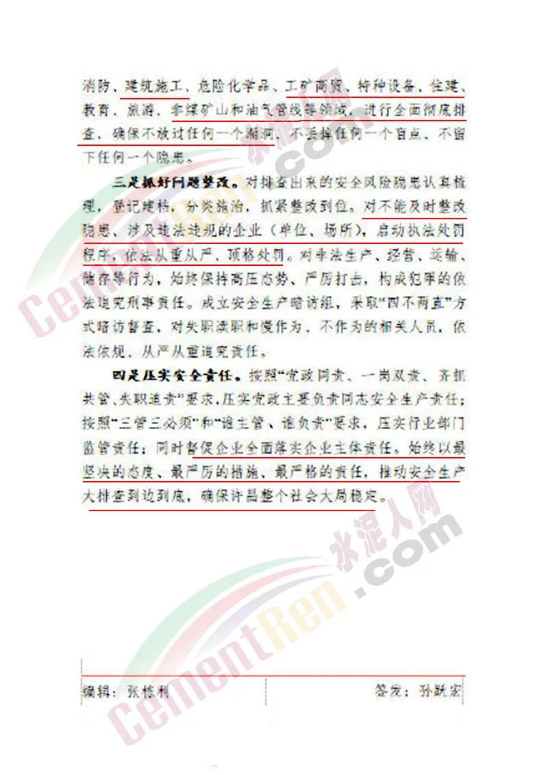 整改措施要求,按照“誰排查誰簽字”的原則,建立隱患排查臺賬,突出散亂污企業(yè)和廢棄廠院、煤礦、交通、消防、建筑施工、危險(xiǎn)化學(xué)品、工礦商貿(mào)、特種設(shè)備、住建、旅游、非煤礦山和油氣管線等領(lǐng)域,進(jìn)行全面徹底排查,確保不放過任何一個漏洞,不丟掉任何一個盲點(diǎn),不留下任何一個隱患。對不能及時整改隱患,涉及違法違規(guī)的企業(yè),啟動執(zhí)法處罰程序 ,依法從重從嚴(yán),頂格處罰。同時壓實(shí)安全責(zé)任,督促企業(yè)全面落實(shí)企業(yè)主體責(zé)任。始終以最堅(jiān)決的態(tài)度 、最嚴(yán)厲的措施,最嚴(yán)格的責(zé)任,推動安全生產(chǎn)大排查到邊到底,確保許昌整個社會大局穩(wěn)定。文件原文如下: