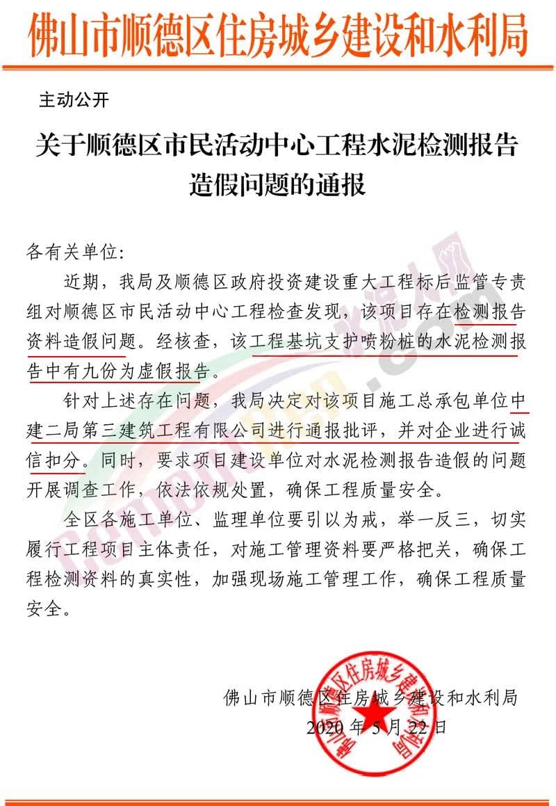 日前,廣東省佛山順德區(qū)住房城鄉(xiāng)建設(shè)和水利局主動公開《關(guān)于順德區(qū)市民活動中心工程水泥檢測報告造假問題的通報》時提到,近期,順德區(qū)住房城鄉(xiāng)建設(shè)和水利局及順德區(qū)政府投資建設(shè)重大工程標后監(jiān)管專責組對順德區(qū)市民活動中心工程檢查發(fā)現(xiàn),該項目存在檢測報告資料造假問題。經(jīng)核查,該工程基坑支護噴粉樁的水泥檢測報告中有九份為虛假報告。針對上述存在問題,決定對該項目施工總承包單位中建二局第三建筑工程有限公司進行通報批評,并對企業(yè)進行誠信扣分。同時,要求項目建設(shè)單位對水泥檢測報告造假的問題開展調(diào)查工作,依法依規(guī)處置,確保工程質(zhì)量安全。