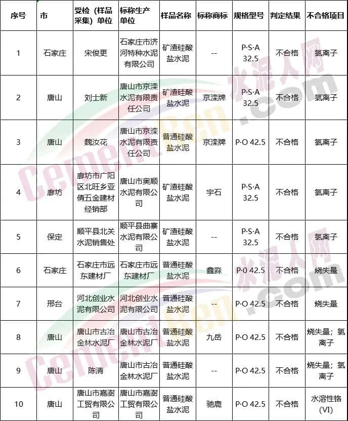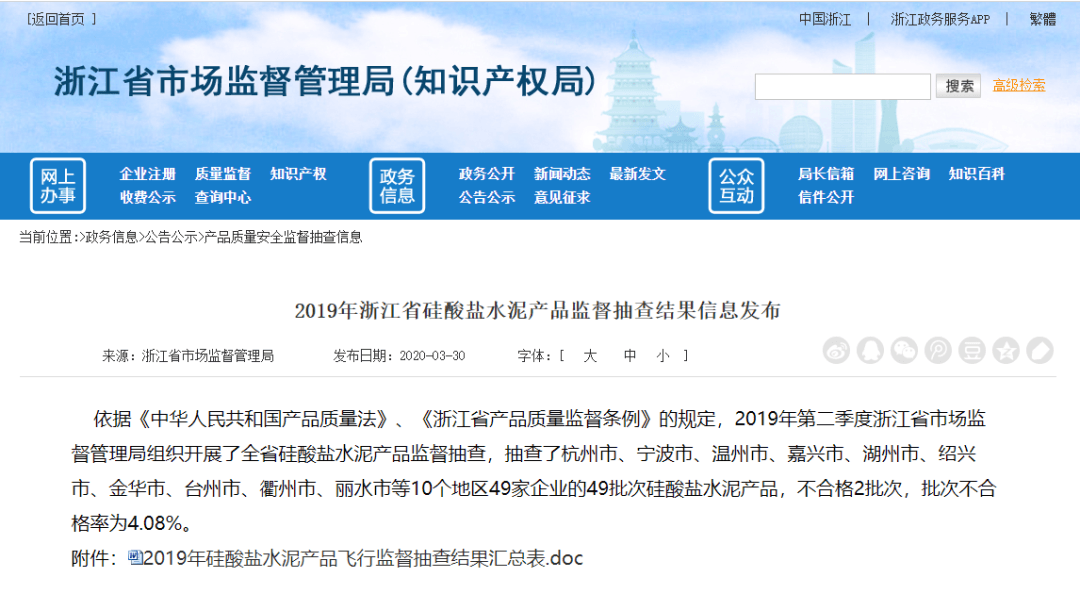 浙江省浙江省市場監(jiān)管局2019年硅酸鹽水泥產(chǎn)品監(jiān)督抽查結(jié)果顯示10個地區(qū)的49個批次產(chǎn)品中不合格2批次,不合格項目為氯離子。