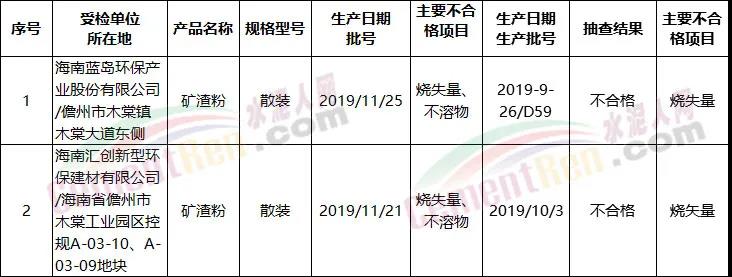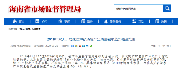 海南省市場監(jiān)督管理局公布2019年水泥、?;郀t礦渣粉產(chǎn)品質(zhì)量省級監(jiān)督抽查結(jié)果顯示,共抽查涉及17家企業(yè)20個批次產(chǎn)品,抽檢水泥、?;郀t礦渣粉產(chǎn)品合格率為90%,檢出2個批次產(chǎn)品不合格,不合格產(chǎn)品檢出率10%。