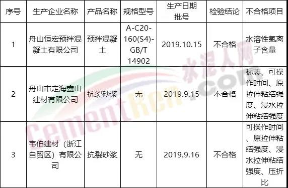 2020年1月,浙江省舟山市市場監(jiān)督管理局網(wǎng)站公布2019年四季度市級產(chǎn)品質(zhì)量監(jiān)督抽查結(jié)果,共抽查了全市8家企業(yè)生產(chǎn)的預(yù)拌混凝土、抗裂砂漿等3種8批次產(chǎn)品,其中合格5批次,不合格3批次,批次合格率為62.5%。