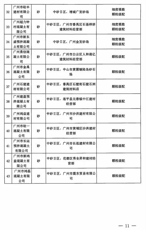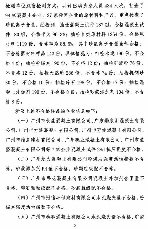 不合格原材料樣品143份,具體情況為:抽檢水泥190份,不合格4份;抽檢粉煤灰190份,不合格12份;抽檢礦渣粉76份,不合格12份;抽檢天然砂286份,不合格74份;抽檢機制砂30份,不合格10份;抽檢礦石198份,不合格17份;抽檢混凝土外加劑190份,不合格8份;抽檢砂漿添加劑104份,不合格8份。不合格樣品的企業(yè)信息如下:
