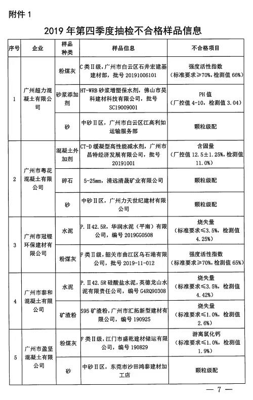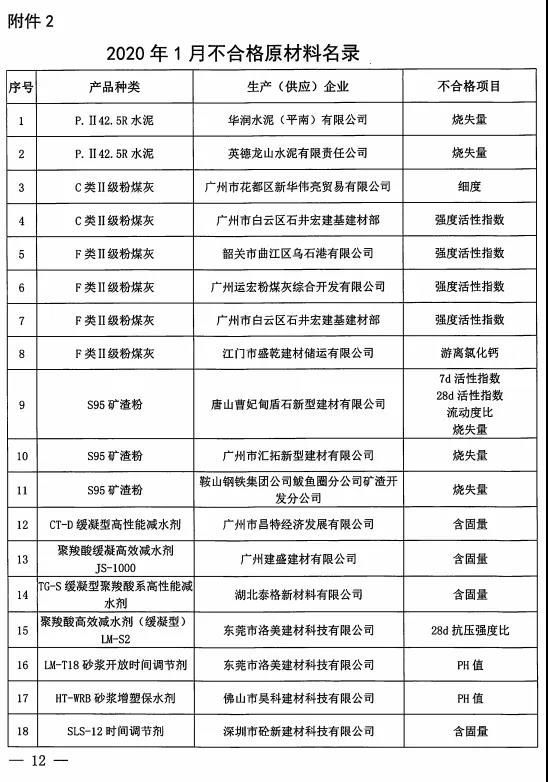 廣州市散裝水泥管理辦公室發(fā)布《關(guān)于2019年第四季度預(yù)拌混凝土、預(yù)拌砂漿生產(chǎn)企業(yè)質(zhì)量監(jiān)督抽檢情況的通報》,共抽檢水泥190份,不合格4份。其中不合格水泥涉及兩家企業(yè),分別為華潤水泥(平南)有限公司、英德龍山水泥有限責任公司,不合格項目均為燒失量。