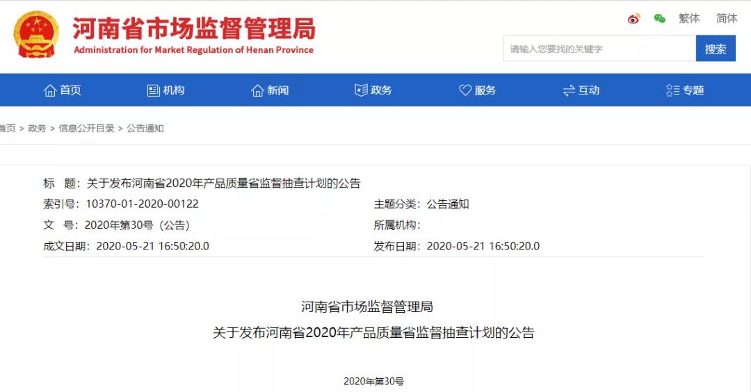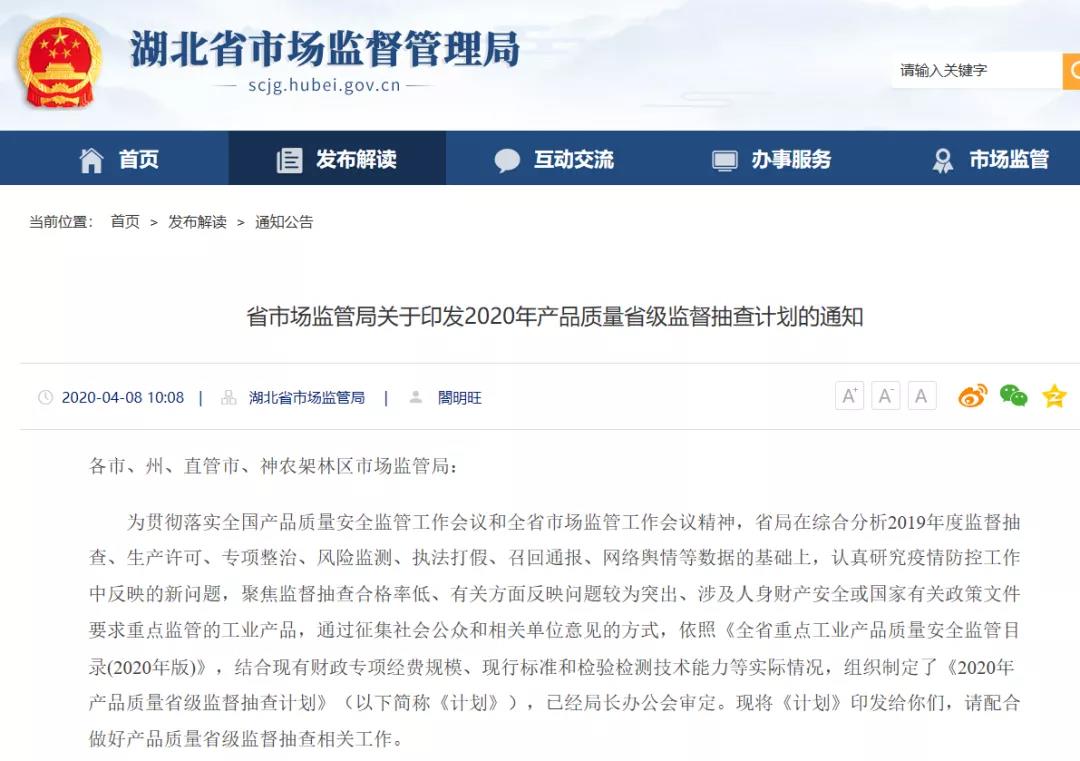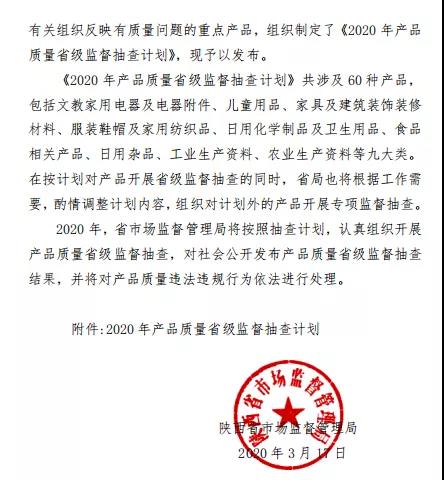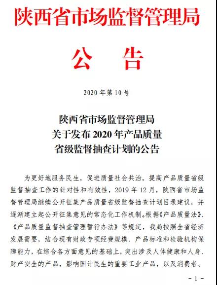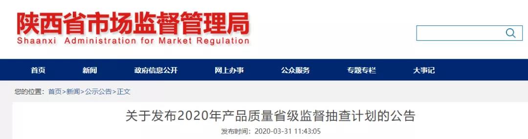 與此同時,湖北、陜西、河南等多個省市地區(qū)陸續(xù)下發(fā)了2020年產(chǎn)品質(zhì)量國家監(jiān)督抽查計劃及細則。
