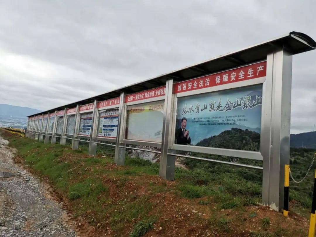 (1)作業(yè)現(xiàn)場。一方面實(shí)行清潔生產(chǎn),購買灑水車進(jìn)行道路灑水降塵,定期檢查維護(hù)收塵設(shè)備,清除設(shè)備積塵、油污,設(shè)備備品備件歸類整齊擺放到指定位置,收集廢油、白色垃圾等下山處理,確保作業(yè)現(xiàn)場清潔。另一方面加強(qiáng)形象宣傳,在礦山視野開闊位置設(shè)置參觀平臺并地面硬化,設(shè)置宣傳欄和宣傳海報,完善齊全礦山現(xiàn)場安全警示標(biāo)示牌。