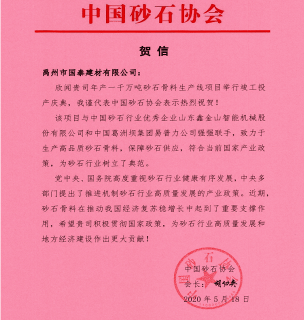 胡會長強調(diào),黨中央國務(wù)院高度重視砂石行業(yè)健康有序發(fā)展,中央多部門提出了推進機制砂石行業(yè)高質(zhì)量發(fā)展的產(chǎn)業(yè)政策。近期,砂石骨料在推動我國經(jīng)濟復(fù)蘇穩(wěn)增長中起到了重要的支撐作用,希望禹州市國泰建材有限公司積極貫徹國家政策,為砂石行業(yè)高質(zhì)量發(fā)展和地方經(jīng)濟建設(shè)做出更大貢獻。