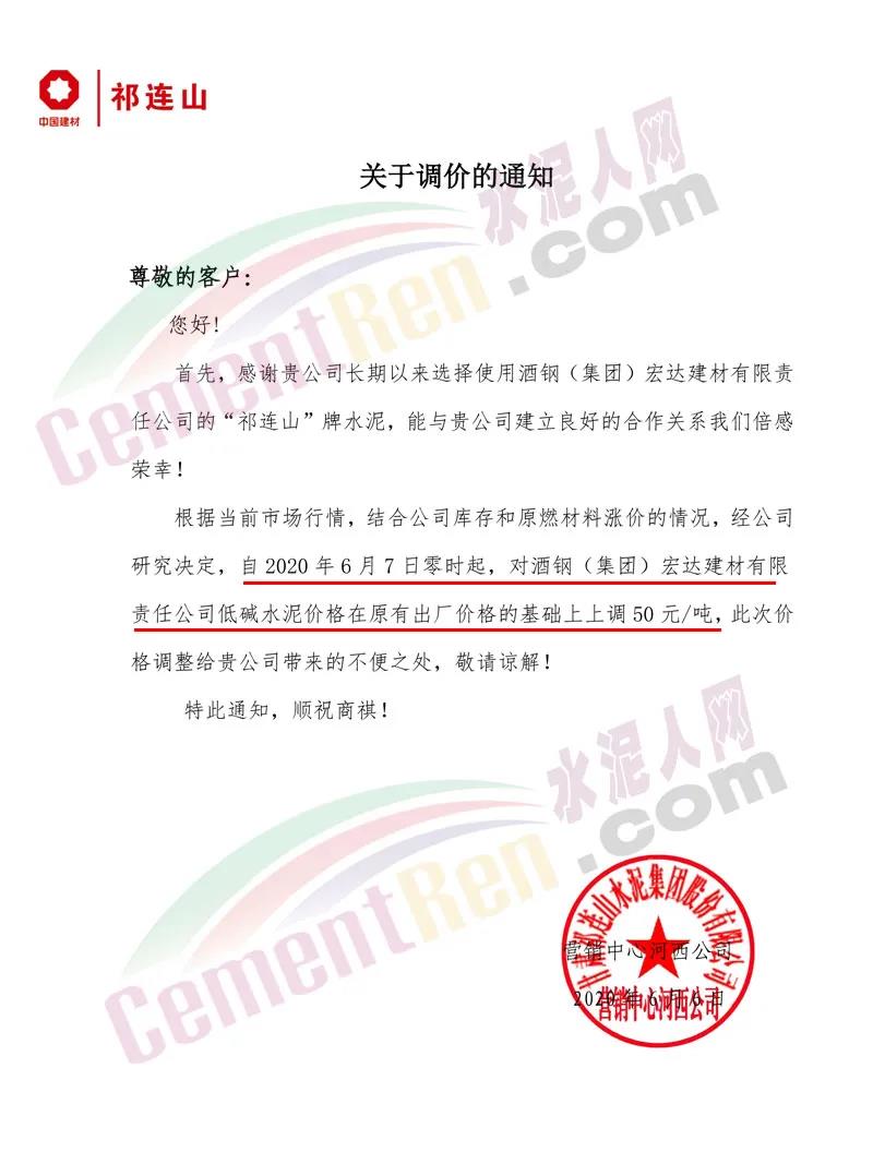 日前,酒鋼(集團(tuán))宏達(dá)建材有限責(zé)任公司(以下簡(jiǎn)稱(chēng)宏達(dá)公司)通知,根據(jù)當(dāng)前市場(chǎng)行情,結(jié)合公司庫(kù)存和原燃材料漲價(jià)的情況,經(jīng)研究決定,自 2020 年 6 月 7 日零時(shí)起,對(duì)酒鋼(集團(tuán))宏達(dá)建材有限責(zé)任公司低堿水泥價(jià)格在原有出廠價(jià)格的基礎(chǔ)上上調(diào) 50 元/噸。