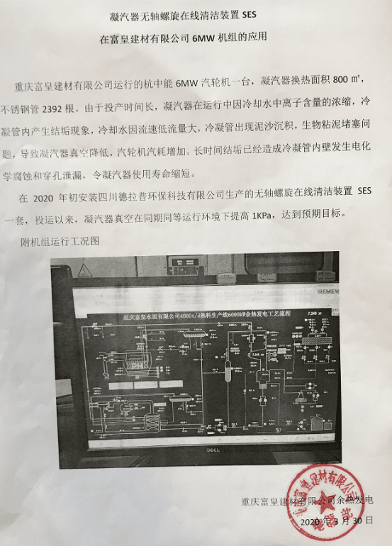 實(shí)事證明,富皇建材當(dāng)初的選擇是沒(méi)有問(wèn)題的,無(wú)軸螺旋在線清潔裝置SES投運(yùn)4年以來(lái),凝汽器真空在同期同等運(yùn)行環(huán)境下提升1kpa,達(dá)到預(yù)期目標(biāo),為富皇建材增加200度發(fā)電量,不僅徹底解決了化學(xué)腐蝕和穿孔泄漏的問(wèn)題,而且還為富皇建材創(chuàng)造了更大的收益,可謂是一舉多得,富皇建材對(duì)于四川德拉普研發(fā)的無(wú)軸螺旋在線清潔裝置SES給予了高度的認(rèn)可和肯定,同時(shí)也希望四川德拉普能夠?qū)⑦@一福利帶給更多的水泥企業(yè)。