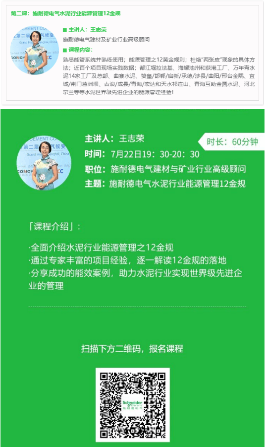 今天晚上,施耐德電氣為大家準備了關于能源管理的“葵花寶典”,主講人為施耐德電氣建材與礦業(yè)行業(yè)高級顧問王志榮老師,通過10年近百余個項目的親身經(jīng)歷,結合全球最先進的能源管理系統(tǒng)與一流水泥工廠的完美融合,精準闡述以下問題:如何做到噸熟料標煤耗下降一公斤以上,工序電耗下降0.7度以上,熟料游離氧化鈣標準偏差下降10%以上?怎么杜絕“兩張皮”,實現(xiàn)能源管理過程可視可控,系統(tǒng)在線率高達99%以上?同樣是水泥廠,別人家怎那么做到了年降低電費近500萬?