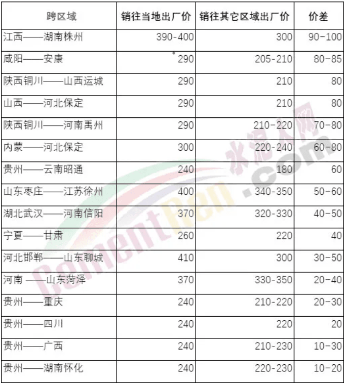 PO42.5水泥,內(nèi)蒙區(qū)域水泥對河北保定市場報價220~240元/噸,對核心市場出廠報價300元/噸。河北邯鄲區(qū)域發(fā)往山東聊城的水泥出廠報價300元/噸,比本地價格低近百元。貴州主流水泥企業(yè)對銷往廣西、云南 、湖南、重慶、四川等區(qū)域的42.5散裝水泥出廠為180~220元/噸之間,但是對本地銷售的水泥出廠價多在300元/噸左右,價差在80~120元/噸左右。