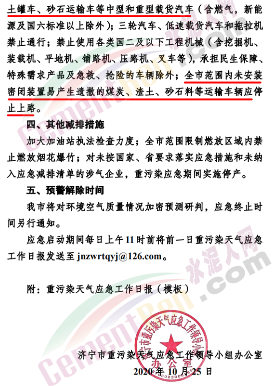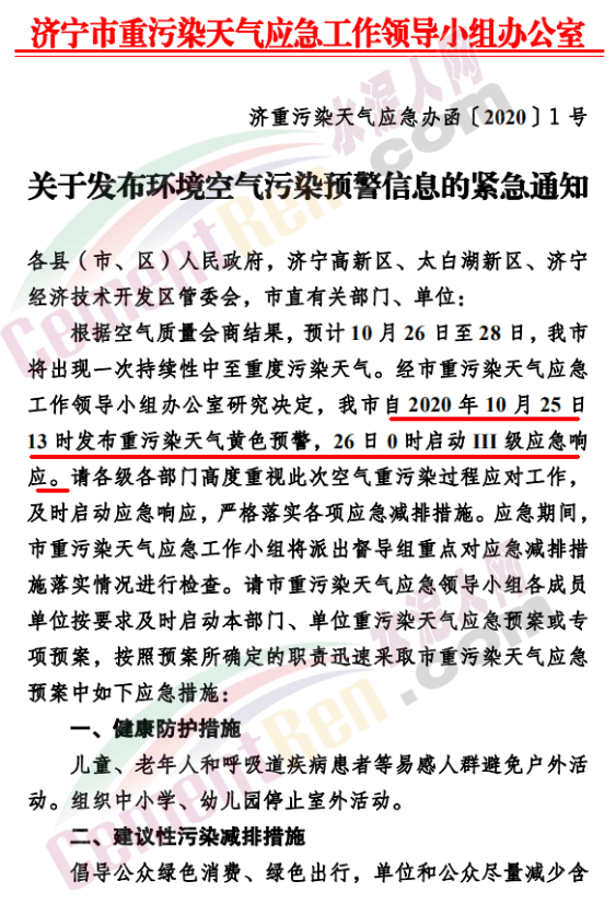 要求工業(yè)企業(yè)按照“一廠一策”的減排要求,通過(guò)停產(chǎn)或部分生產(chǎn)線限產(chǎn)方式實(shí)現(xiàn)減排,凡出現(xiàn)超標(biāo)排放和達(dá)不到應(yīng)急減排清單措施目標(biāo)的原則停產(chǎn),不能立即停產(chǎn)的最大程度限產(chǎn)并提高治污設(shè)施運(yùn)行效率。礦山、砂石料場(chǎng)、石材廠、石板廠等停止露天作業(yè);除涉及重大民生工程、安全生產(chǎn)及應(yīng)急搶險(xiǎn)任務(wù)外,停止可能產(chǎn)生揚(yáng)塵的港口作業(yè)、煤礦煤場(chǎng)作業(yè)、堆場(chǎng)作業(yè)、建筑和拆遷施工及長(zhǎng)距離工程等涉及土石方作業(yè)環(huán)節(jié),施工工地還應(yīng)停止建筑拆除、噴涂粉刷、護(hù)坡噴漿、混凝土攪拌等。除城市運(yùn)行保障車輛和執(zhí)行特種任務(wù)車輛外,濟(jì)寧市限行區(qū)以內(nèi)禁行建筑垃圾和渣土運(yùn)輸車、混凝土罐車、砂石運(yùn)輸車等中型和重型載貨汽車。全市范圍內(nèi)未安裝密閉裝置易產(chǎn)生遺撒的煤炭、渣土、砂石料等運(yùn)輸車輛應(yīng)停止上路。對(duì)未按國(guó)家、省要求落實(shí)應(yīng)急措施和未納入應(yīng)急減排清單的涉氣企業(yè),重污染應(yīng)急期間實(shí)施停產(chǎn)。通知原文如下: