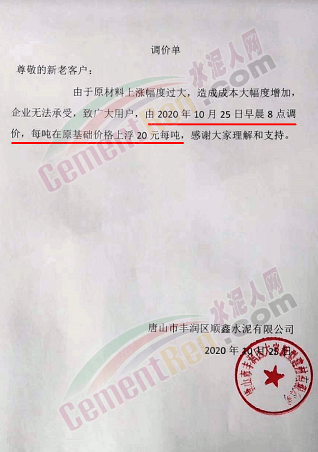 唐山市豐潤(rùn)區(qū)順鑫水泥有限公司通知,由于原材料上漲幅度過(guò)大,造成成本大幅度增加,企業(yè)無(wú)法承受。自10月25日早8點(diǎn)起,水泥價(jià)格上浮20元/噸。