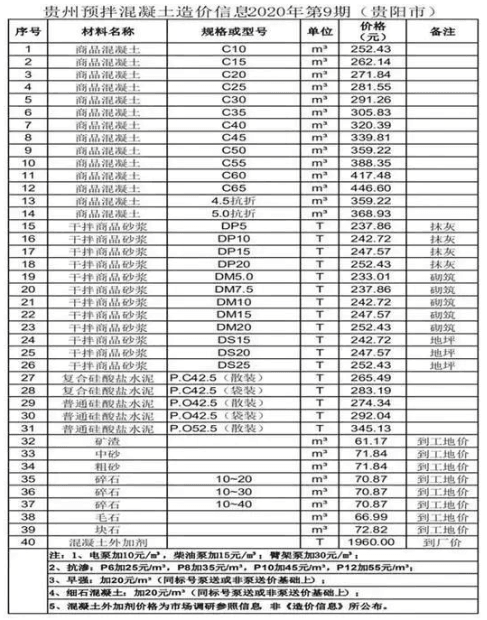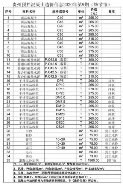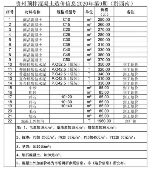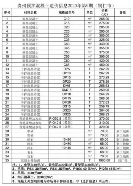 近日,貴州省預(yù)拌混凝土行業(yè)協(xié)會(huì)發(fā)布了貴州省預(yù)拌混凝土造價(jià)信息2020年第9期。造價(jià)信息顯示,商品混凝土平均價(jià)格高于干拌商品砂漿、硅酸鹽水泥等其他預(yù)拌混凝土。其中,黔南州商品混凝土C65價(jià)格最高,為455元/立方;黔南州毛石價(jià)格最低,為55元/立方。