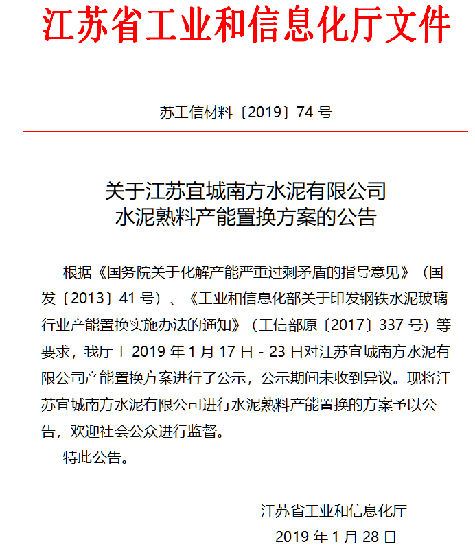 據(jù)水泥人網(wǎng)了解,今年1月末,江蘇工信廳發(fā)布《關(guān)于江蘇宜城南方水泥有限公司水泥熟料產(chǎn)能置換方案的公告》稱根據(jù)相關(guān)文件要求,于2019年1月17日-23日對江蘇宜城南方水泥有限公司產(chǎn)能置換方案進行了公示,公示期間未收到異議。并將江蘇宜城南方水泥有限公司進行水泥熟料產(chǎn)能置換的方案予以公告。