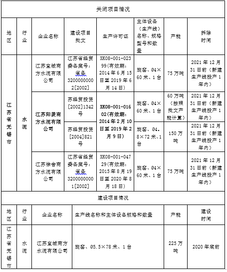 公告內(nèi)容顯示,建設(shè)項目為一條年產(chǎn)225萬噸的熟料生產(chǎn)線,回轉(zhuǎn)窯直徑為5.5×78米,建設(shè)時間為2020年底前。關(guān)閉退出項目為江蘇陽羨南方水泥有限公司210萬噸生產(chǎn)線、江蘇徐舍南方水泥有限公司75萬噸生產(chǎn)線和江蘇宜城南方水泥有限公司原有75萬噸生產(chǎn)線,退出時間為2021年12月31日前,即新建生產(chǎn)線投產(chǎn)一年內(nèi)。