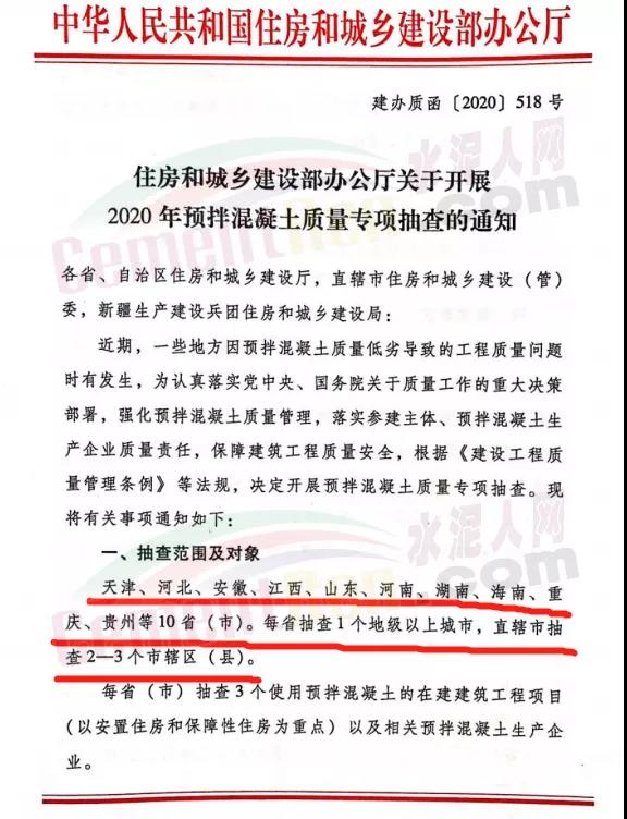 一、抽查范圍及對象:天津、河北、安徽、江西、山東、河南、湖南、海南、重慶、貴州等10省(市),每省抽查1個(gè)地級(jí)以上城市,直轄市抽查2~3個(gè)市轄區(qū)(縣)。每省(市)抽查3個(gè)使用預(yù)拌混凝土的在建建筑工程項(xiàng)目以及相關(guān)預(yù)拌混凝土生產(chǎn)企業(yè)。二、抽查內(nèi)容:受檢工程的建設(shè)、施工、監(jiān)理、預(yù)拌混凝土生產(chǎn)等單位及其從業(yè)人員執(zhí)行混凝土質(zhì)量相關(guān)法律法規(guī)和工程建設(shè)強(qiáng)制性標(biāo)準(zhǔn)情況;工程實(shí)體混凝土質(zhì)量情況等。三、抽查時(shí)間:抽時(shí)間從2020年11月開始,具體時(shí)間另行通知。通知全文如下: