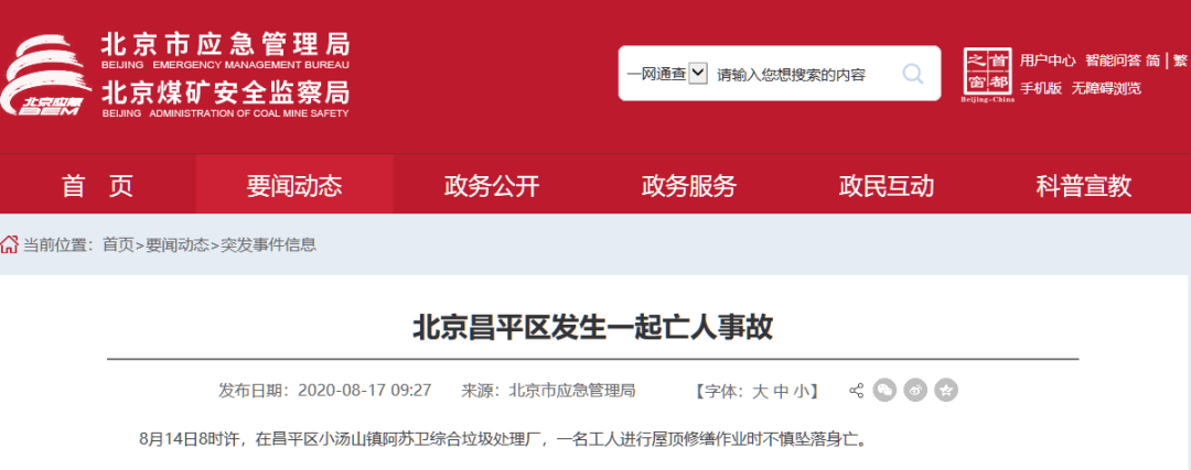 8月14日8時(shí)許,在昌平區(qū)小湯山鎮(zhèn)阿蘇衛(wèi)綜合垃圾處理廠,一名工人進(jìn)行屋頂修繕作業(yè)時(shí)不慎墜落身亡。