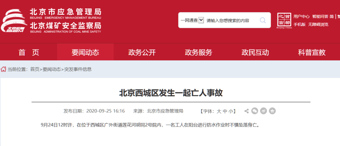 9月24日12時(shí)許,在位于西城區(qū)廣外街道蓮花河胡同2號院內(nèi),一名工人在陽臺(tái)進(jìn)行防水作業(yè)時(shí)不慎墜落身亡。
