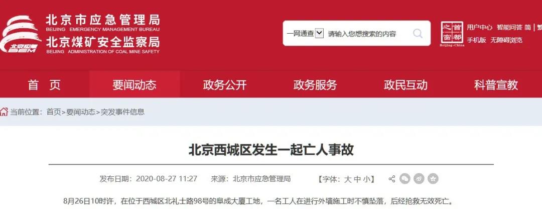 8月26日10時(shí)許,在位于西城區(qū)北禮士路98號的阜成大廈工地,一名工人在進(jìn)行外墻施工時(shí)不慎墜落,后經(jīng)搶救無效死亡。