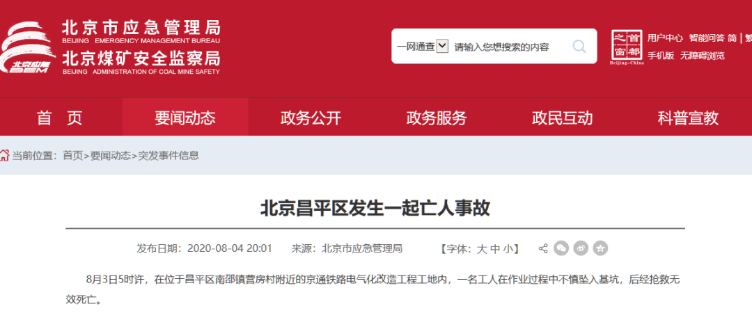 8月3日5時(shí)許,在位于昌平區(qū)南邵鎮(zhèn)營房村附近的京通鐵路電氣化改造工程工地內(nèi),一名工人在作業(yè)過程中不慎墜入基坑,后經(jīng)搶救無效死亡。