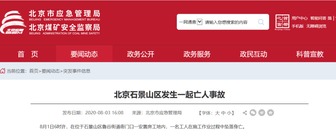 8月1日6時(shí)許,在位于石景山區(qū)魯谷街道衙門口一安置房工地內(nèi),一名工人在施工作業(yè)過程中墜落身亡。