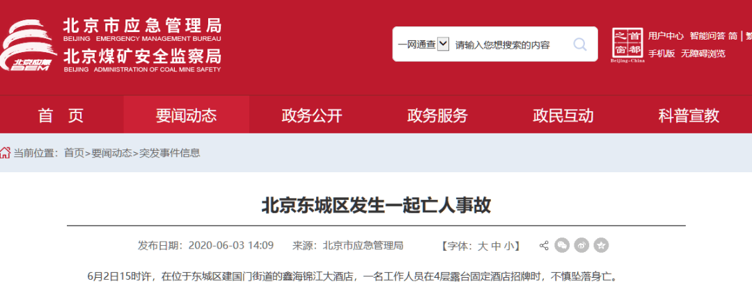 6月2日15時(shí)許,在位于東城區(qū)建國門街道的鑫海錦江大酒店,一名工作人員在4層露臺(tái)固定酒店招牌時(shí),不慎墜落身亡。