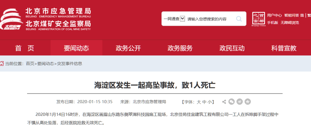 1月14日16時(shí)許,在海淀區(qū)畫眉山東路東側(cè)翠湖科技園施工現(xiàn)場,北京佳苑佳宜建筑工程有限公司一工人在拆除腳手架過程中不慎從高處墜落,后經(jīng)醫(yī)院搶救無效死亡。