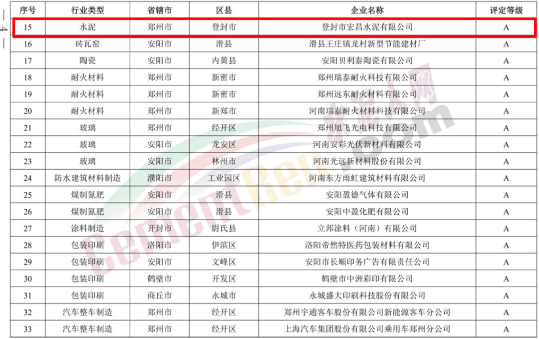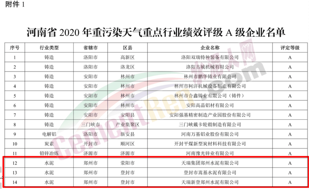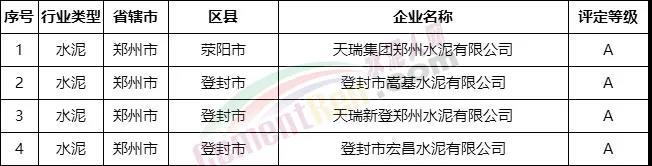 其中鄭州登封市四家水泥企業(yè)獲評A級企業(yè),分別為天瑞集團鄭州水泥有限公司、登封市嵩基水泥有限公司、天瑞新登鄭州水泥有限公司、登封市宏昌水泥有限公司。