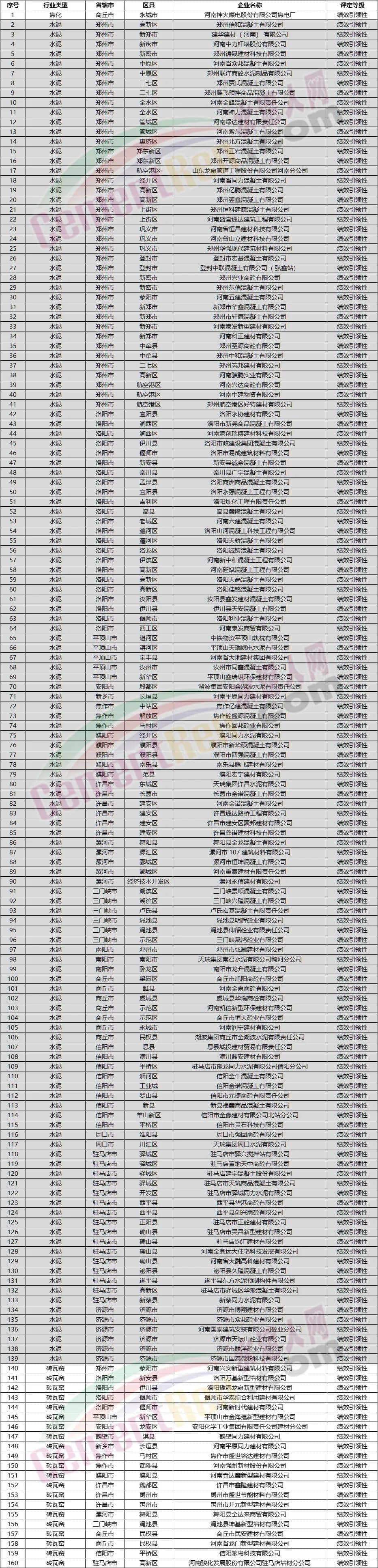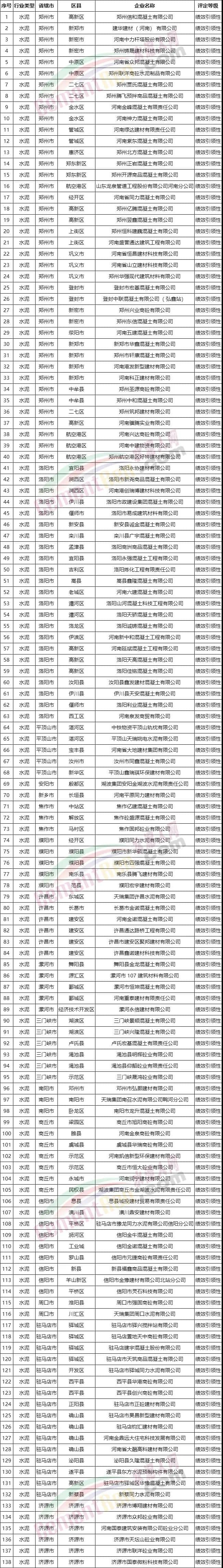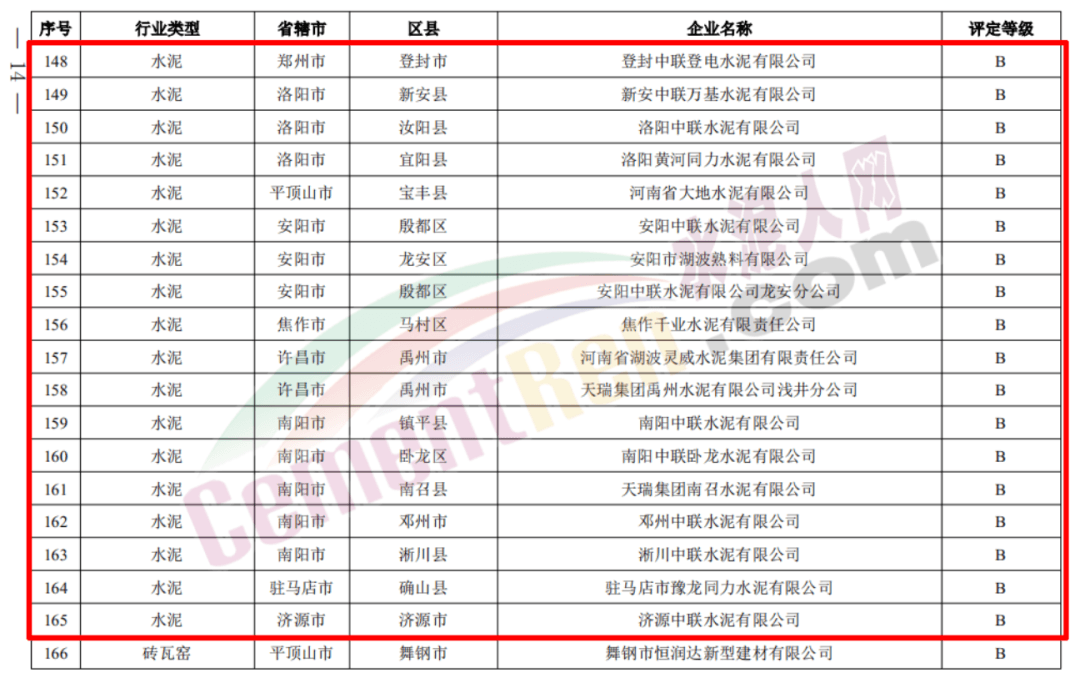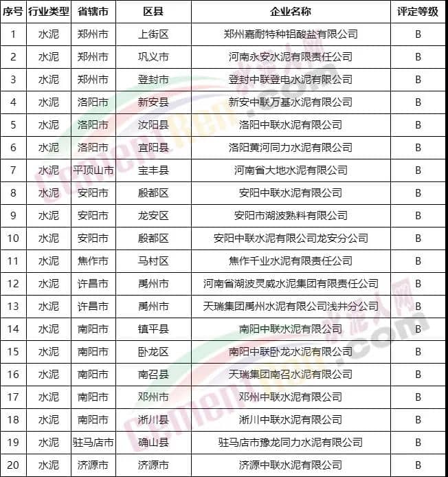 包括登封中聯(lián)、新安中聯(lián)、洛陽中聯(lián)、濟源中聯(lián)、鄧州中聯(lián)、淅川中聯(lián)、南陽中聯(lián)、安陽中聯(lián)、安陽湖波、大地水泥等20家企業(yè)獲評B級。