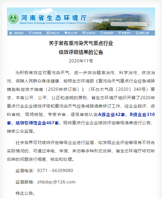 日前,河南省生態(tài)環(huán)境廳發(fā)布《關(guān)于發(fā)布重污染天氣重點行業(yè)績效評級結(jié)果的公告》稱,為積極有效應對重污染天氣,進一步突出精準治污、科學治污、依法治污,保障人民群眾身體健康,按照生態(tài)環(huán)境部《重污染天氣重點行業(yè)應急減排措施制定技術(shù)指南(2020年修訂版)》(環(huán)辦大氣函〔2020〕340號)要求,本著公開、公平、公正和透明的原則,河南省生態(tài)環(huán)境廳組織開展了2020年重點行業(yè)企業(yè)績效評級和重污染天氣應急減排清單修訂工作,經(jīng)企業(yè)自評、資料審核、現(xiàn)場核驗、專家會審,逐級審核認定A級企業(yè)42家、B級企業(yè)310家、績效引領(lǐng)性企業(yè)467家。