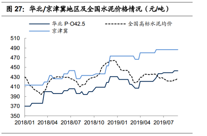 由于今年需求的增加,截至 8 月 30 日,華北地區(qū)和京津冀地區(qū)高標(biāo)水泥分別報價 443 元/噸和 487 元/噸, 同比上漲 10.86%和 14.06%,處于歷史同期高位水平。