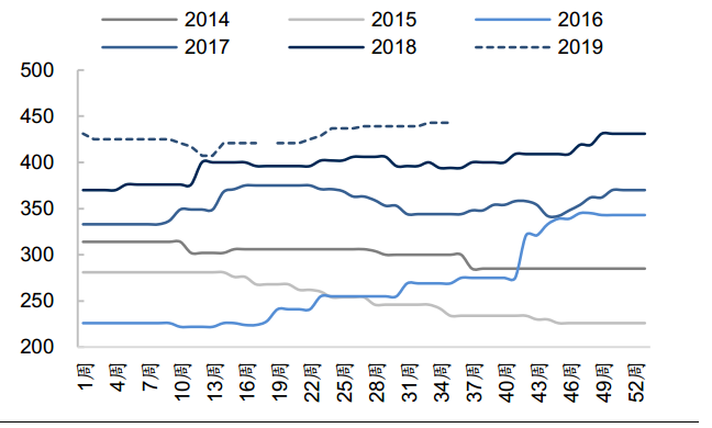 下圖是近六年華北地區(qū)同期水泥價格,可以看出2019年是近六年最高的一年。期高位水平。
