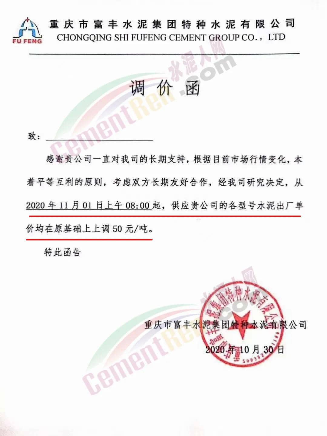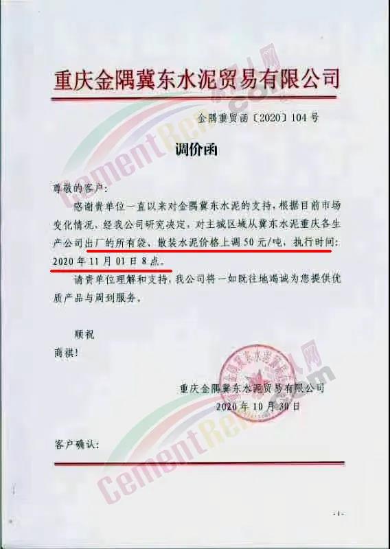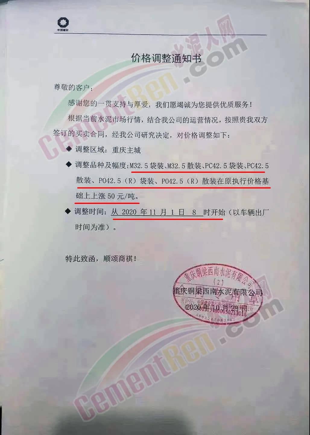 根據(jù)市場情況,經(jīng)研究,決定從2020年11月1日零時起,本公司發(fā)往福建省內(nèi)各品種各規(guī)格型號水泥在原價格基礎(chǔ)上上調(diào)30元/噸。