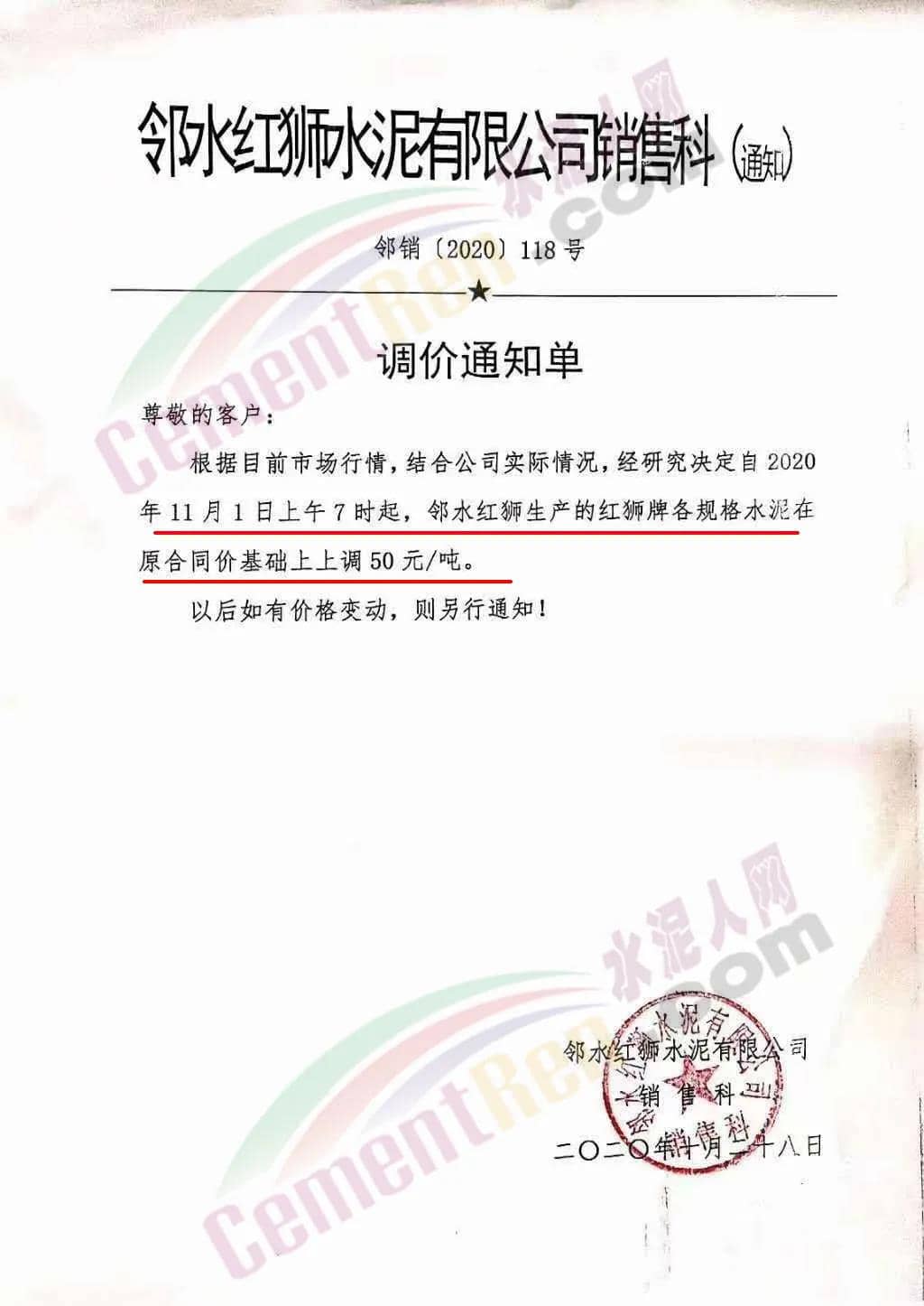 鄰水紅獅水泥銷售科通知自11月1日早7時起,鄰水紅獅生產(chǎn)的紅獅牌各規(guī)格水泥在原合同價基礎(chǔ)上上調(diào)50元/噸。