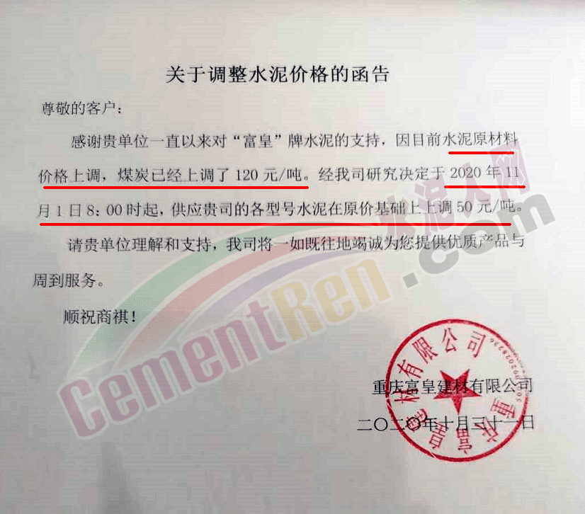 重慶富皇建材有限公司通知,因水泥原材料價格上漲,煤炭已經(jīng)上調(diào)120元/噸,公司決定于11月1日8時起,上調(diào)“富皇”水泥各標號價格50元/噸。