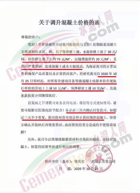 肇慶某混凝土公司發(fā)函通知稱,近期隨著混凝土主要原材料水泥、砂、石子等價格上漲,水泥價格上漲了30元/噸,砂價格上漲了大約75元/m³,運輸費漲價約20元/m³,且供應(yīng)嚴重緊缺,造成混凝土成本大幅提高,為保證公司的正常運作和確保產(chǎn)品質(zhì)量以及正常供應(yīng)客戶,經(jīng)研究公司自2020年10 月25日零時起,對所有在建項目各等級混凝土結(jié)算單價在現(xiàn)執(zhí)行單價的基礎(chǔ)上上調(diào)50元/m³,預(yù)拌砂漿上調(diào)60元/m³,其他條款按原合同繼續(xù)執(zhí)行。