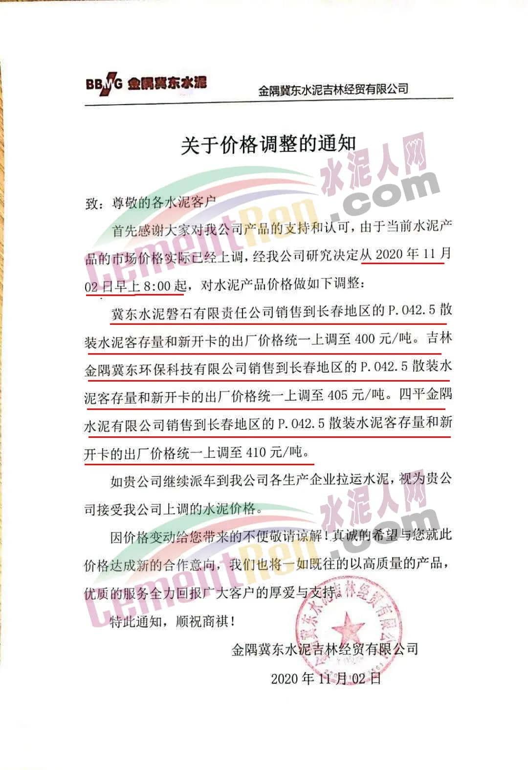 冀東水泥磐石有限責(zé)任公司銷售到長春地區(qū)的P.042.5散裝水泥客存量和新開卡的出廠價(jià)格統(tǒng)一上調(diào)至400元/噸。