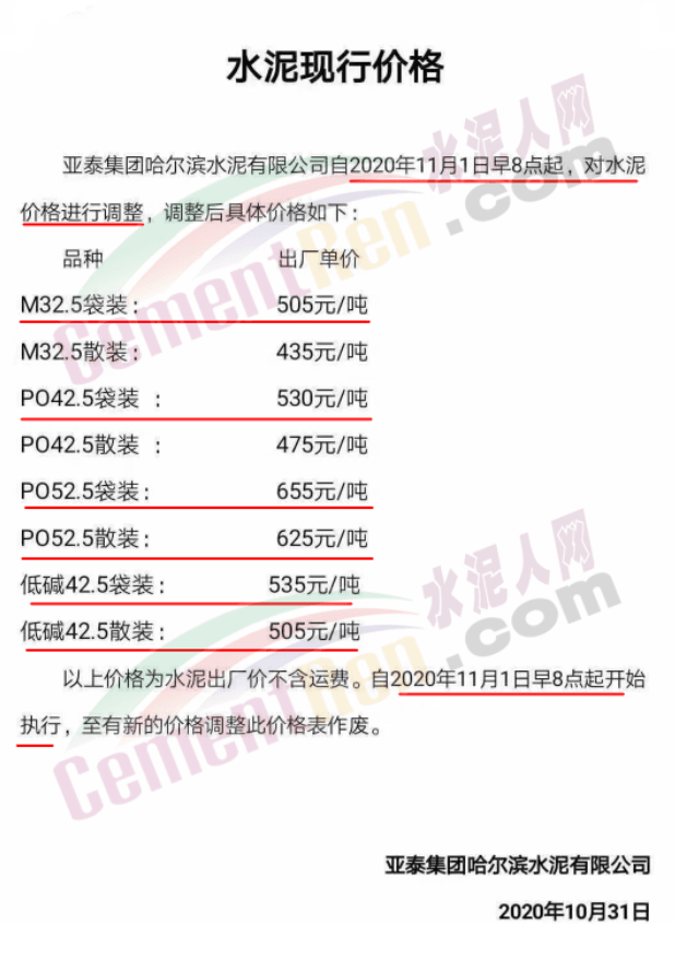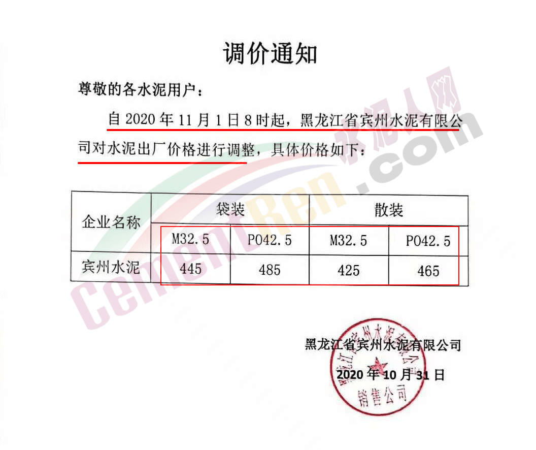 黑龍江賓州水泥有限公司也通知11月1日8時起上調(diào)水泥價(jià)格,漲價(jià)后M32.5袋裝水泥執(zhí)行445元/噸,PO42.5水泥執(zhí)行485元/噸,M32.5散裝水泥執(zhí)行425元/噸,PO42.5散裝執(zhí)行465元/噸。