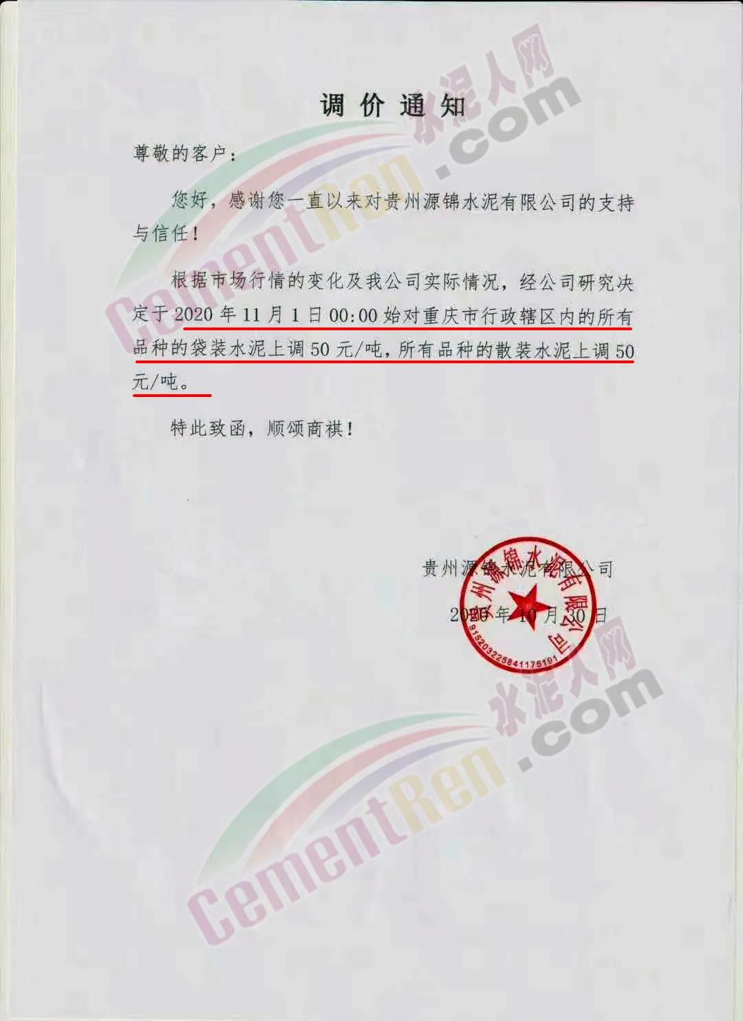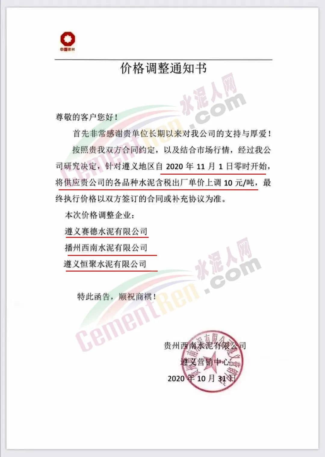 同期,貴州遵義區(qū)域主要品牌企業(yè)西南水泥旗下遵義賽德水泥、播州西南水泥、遵義恒水泥三家工廠通知各品種水泥含稅出廠價(jià)上調(diào)10元/噸。