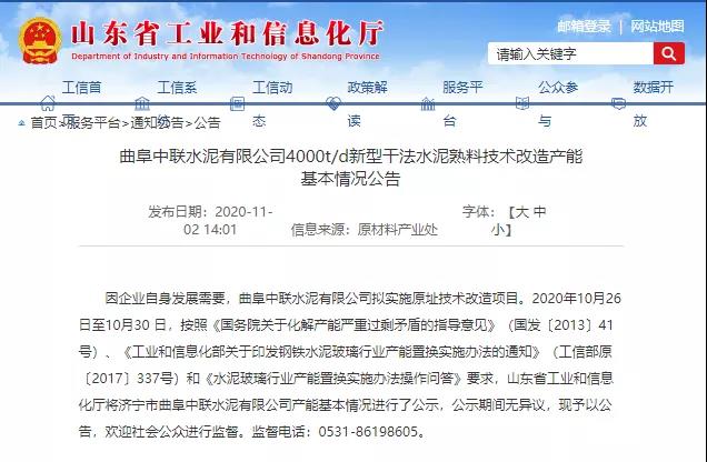 曲阜中聯(lián)水泥新建4000t/d水泥熟料生產線公告