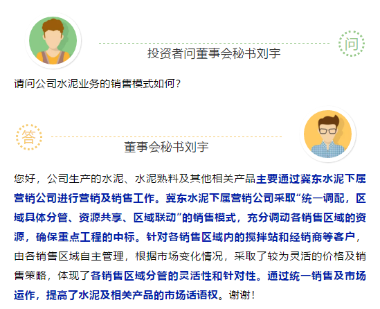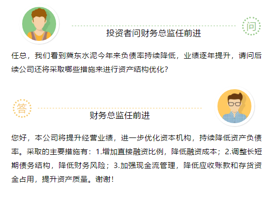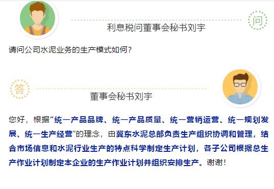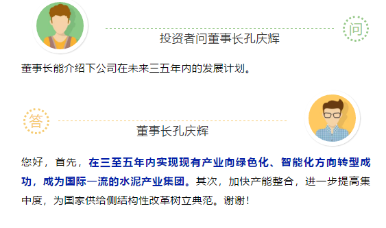 5.成本優(yōu)勢:公司持續(xù)做實做優(yōu)生產(chǎn)運營管控,為實現(xiàn)高質(zhì)量發(fā)展,持續(xù)推進(jìn)“培優(yōu)”工作,以培優(yōu)為平臺的對標(biāo)、總結(jié)、互相借鑒、 學(xué)習(xí),營造了標(biāo)桿引領(lǐng)、爭先創(chuàng)優(yōu)的地良好企業(yè)發(fā)展氛圍;持續(xù)加大技改投入,以篦冷機、預(yù)熱器、預(yù)粉磨設(shè)備等主機提效 為重點加速消除落后工藝、低效裝備;引進(jìn)、推廣成熟、有效的節(jié)能降耗技術(shù)措施,降耗能力提升;持續(xù)推進(jìn)直供電工作, 成本控降效果顯著;結(jié)合各區(qū)域產(chǎn)品質(zhì)量的差異化需求,按區(qū)域制定質(zhì)量標(biāo)準(zhǔn),著力解決水泥產(chǎn)品面臨的同質(zhì)化、低附加值 等重大共性問題,開發(fā)適應(yīng)市場的高性能定制化水泥。使得公司在布局區(qū)域的成本競爭優(yōu)勢明顯,為公司產(chǎn)能釋放、效益提升奠定了基礎(chǔ)。6.人才優(yōu)勢:公司堅持實施“人才強企”戰(zhàn)略,培養(yǎng)造就了一批綜合素質(zhì)好的優(yōu)秀經(jīng)營管理人才和素質(zhì)一流的高級專業(yè)技術(shù)人才隊伍, 建設(shè)了一支符合公司發(fā)展需要的優(yōu)秀年輕骨干人才梯隊;通過引進(jìn)科技領(lǐng)軍人才、高級技術(shù)專家等高端優(yōu)秀人才,匯聚高端智力資源,充分發(fā)揮高層次人才在推動公司發(fā)展的引領(lǐng)作用。報告期,公司人才結(jié)構(gòu)持續(xù)優(yōu)化、布局更加合理,一批職業(yè)素 養(yǎng)好、開拓能力強的經(jīng)營管理人員成為公司人才競爭的比較優(yōu)勢。謝謝!