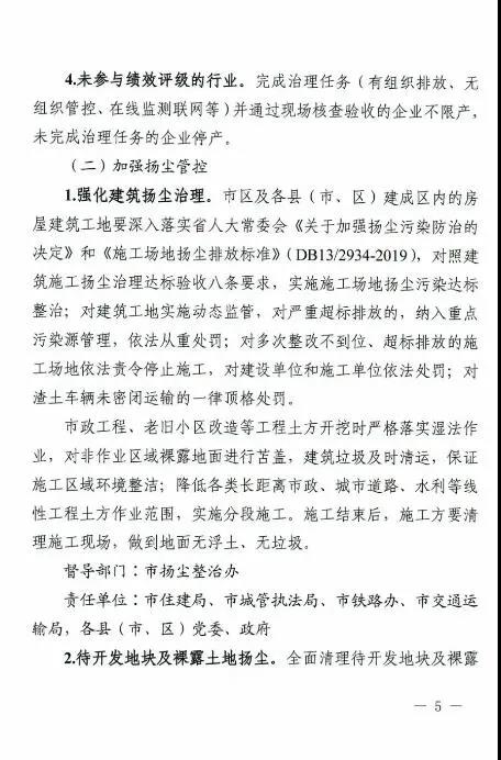1.強化建筑揚塵治理。市區(qū)及各縣(市、區(qū))建成區(qū)內的房屋建筑工地要深入落實省人大常委會《關于加強揚塵污染防治的決定》和《施工場地揚塵排放標準》(DB13/2934-2019),對照建筑施工揚塵治理達標驗收八條要求,實施施工場地揚塵污染達標整治;對建筑工地實施動態(tài)監(jiān)管,對嚴重超標排放的,納入重點污染源管理,依法從重處罰;對多次整改不到位、超標排放的施工場地依法責令停止施工,對建設單位和施工單位依法處罰;對渣土車輛未密閉運輸的一律頂格處罰。