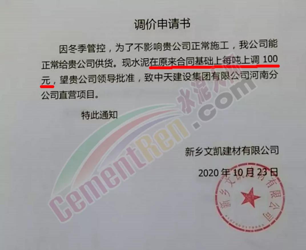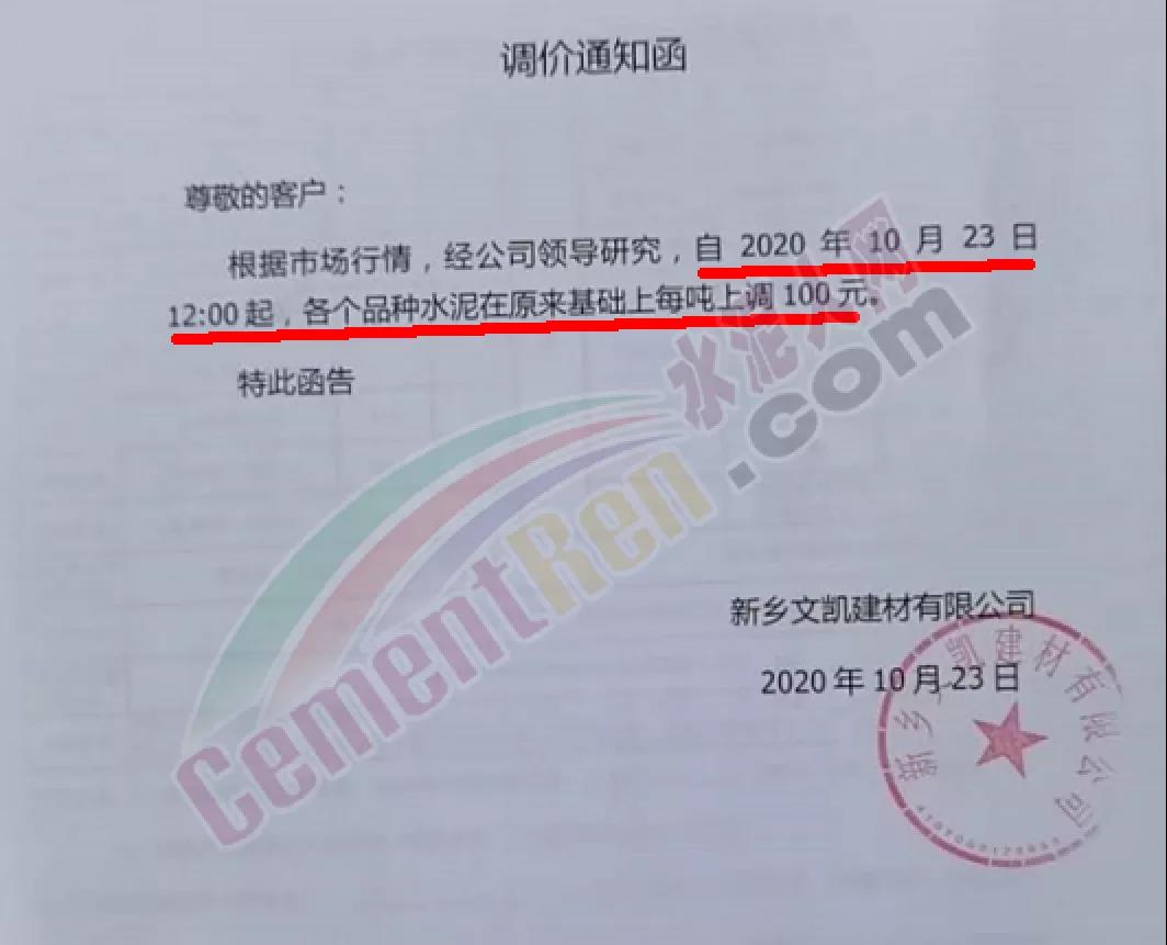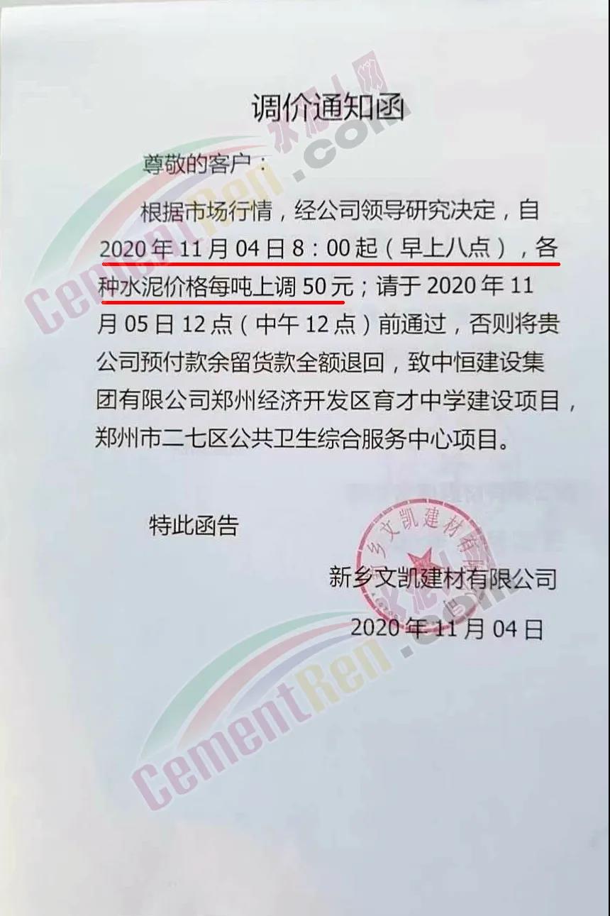 水泥人網(wǎng)通訊員消息:日前新鄉(xiāng)區(qū)域水泥經(jīng)銷商文凱建材公司通知自11月4日早8時(shí)起上調(diào)各品種水泥價(jià)格50元/噸。且要求客戶在11月5日12時(shí)前確認(rèn),否則將退回余留貨款。